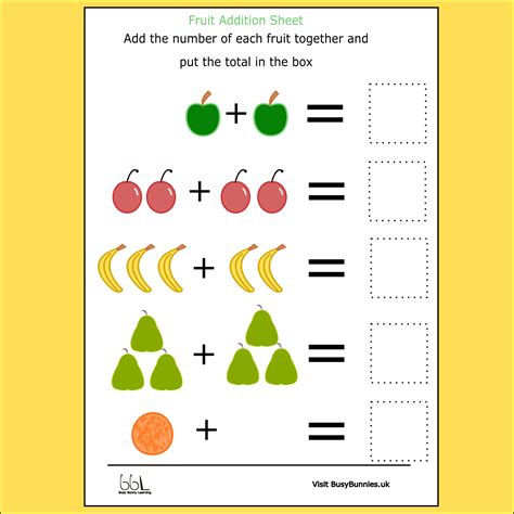 Kids will enjoy learning about fruit and brushing up on basic skills with our set of free printable fruit worksheets. The worksheet features 5 different sums using numbers up to 20.make. Addition equations worksheet for kids.